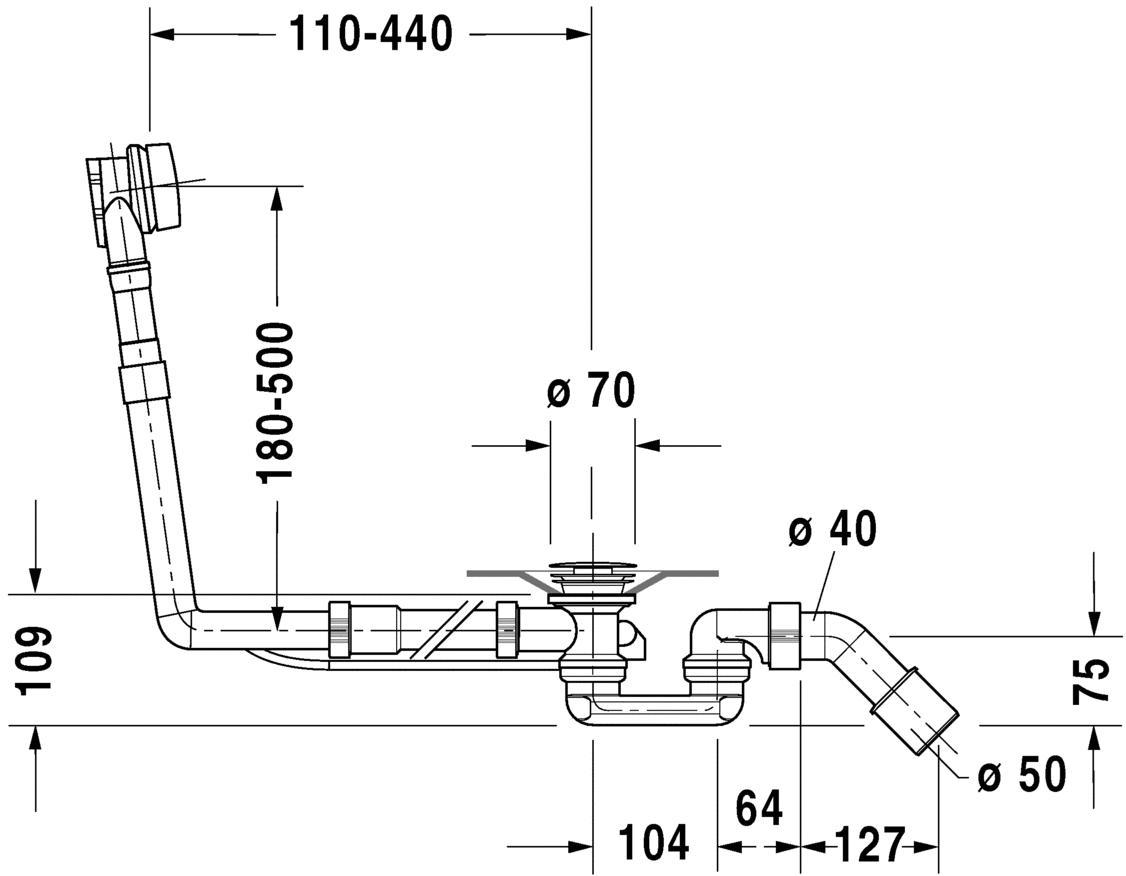 Duravit Paiova Af- og overløbssæt Quadroval krom til badekar med afløb i midten. Afløbshoved 52 mm. Kabellængde 850 mm.  |