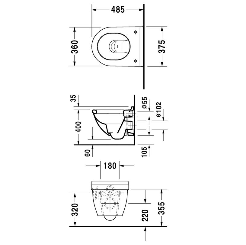 Duravit Starck 3 compact væghængt toilet m/skjult montering Duravit Stack 3 compact hængeskål med skjult befæstigelse. Denne hængeskål er super flot og med Duravit´s høje kvalitet er det helt sikkert en hængeskål du bliver glad for. Skålen har nogle flotte og enkle linjer der gør at den passer til alle stilarter, både den minimalistiske stil og den mere romantiske stil. Denne model fås også med Duravit Wonderglis. Det er et ekstra lag glasur der gør skålen meget mere modstandsdygtig overfor snavs og kalk. Skålens flotte finish bevares ved blot ved almindelig rengøring. Denne model finder du under varianter (ved siden af billedet). Der findes flere flotte sæder der passer til denne skål. Disse finder du under relaterede varer. Her finder du også de andre ting der skal bruges til en komplet løsning med en hængeskål, nemlig indbygningscisterner og trykknapper dertil. Hængeskålen leveres med Durafix2 beslag for skjult montering på en indbygningscisterne. Montage på eksisterende indbygget cisterne: