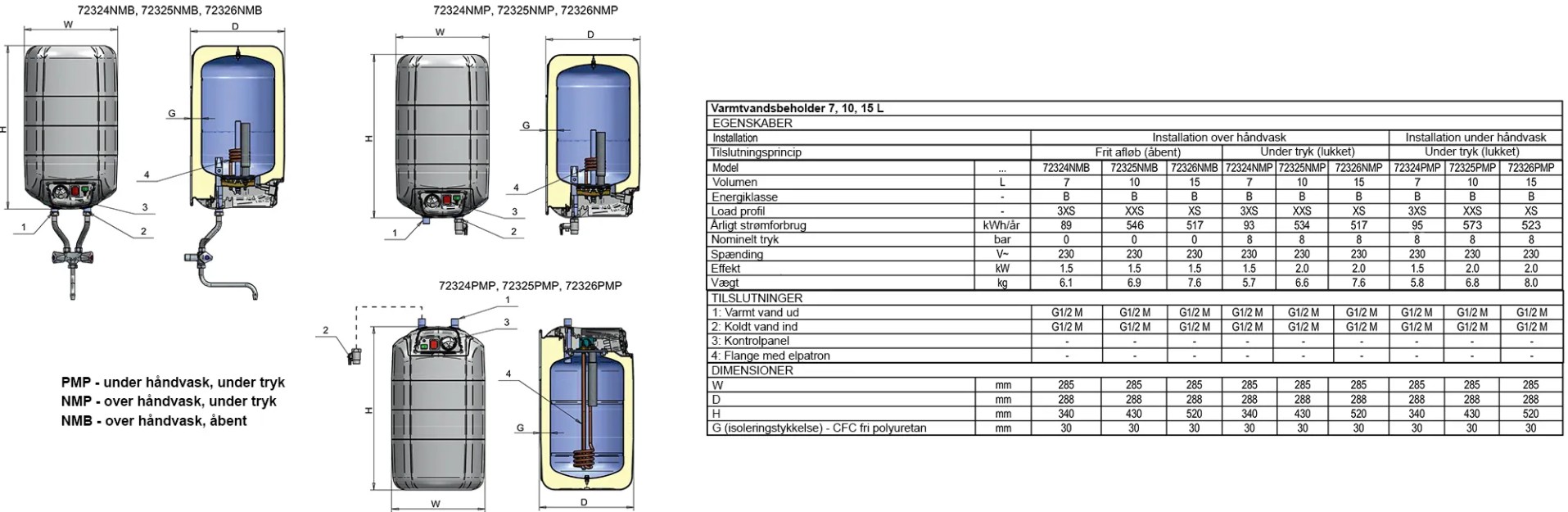 Eldom Varmtvandsbeholder 7 L - Til ophængning over håndvask Effektiv varmtvandsbeholder / vandvarmer til over håndvasken, fra ELDOMINVEST Hurtig og nem installation. En ideel varmtvandsbeholder til rum uden indlagt varmt vand eller til yderligere opvarmning af forvarmet vand, f.eks. fra 30 °C vand fra buffertank, til 65 °C vand til opvasken. Vandvarmeren er isoleret med 30mm miljøvenligt (CPC fri) polyurethanskum. Det sikrer minimalt varmetab og derved energibesparelser. Beholderen er emaljeret og rystbeskyttet for at sikre lang holdbarhed. Vi anbefaler tilkøb af sikkerhedsamatur - 8 bar til alle varmtvandsbeholdere.
