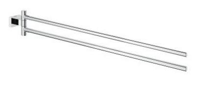 Praktisk svingbar håndklædeholder fra Grohe's Essential Cube-serie. Denne serie af badeværelsestilbehør kendetegnes ved den firkantede vægrosette, som også findes på resten af tilbehøret.