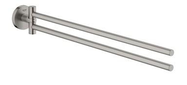 Grohe Essentials håndklædeholder - Steel Denne fleksible og praktiske GROHE Essentials håndklædering med to drejearme er designet til vægmontering ved siden af vasken og sørger for, at håndklæder altid er lige ved hånden. Med den blændende og slidstærke GROHE StarLight elægning vil den se ny ud i mange år.