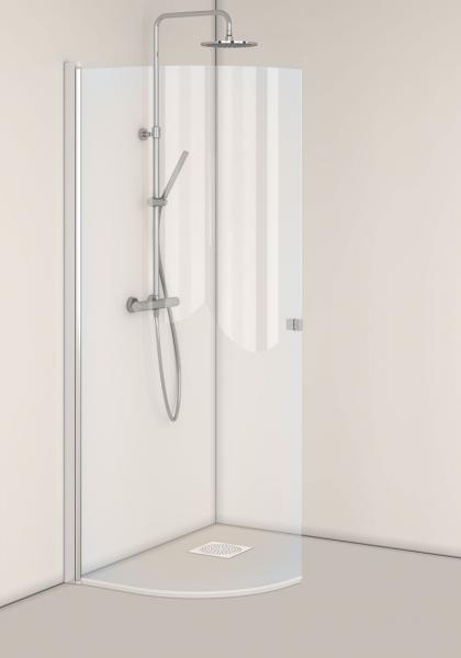Monteringsvenlig J-dør med limbar profil i aluminium. Vendbar. Nem at installere og justere for én person, InstaQuick™. 6 mm hærdet sikkerhedsglas. 8 mm frihøjde fra gulvet. Højde 2000 mm. Kan monteres med udvendige 12-mm-rør, cc 35 mm. 18 mm glideskinne medfølger.