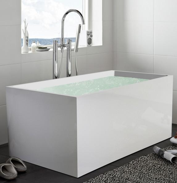 Fritstående designbadekar med lige, elegante former. I ekstra stabil, farvebestandig sanitetsakryl. Overfladen har ingen samlinger, hvilket gør karret nemt at rengøre. Justerbare fødder. Badedybde 460 mm. Mål: 1570X750X600 mm.