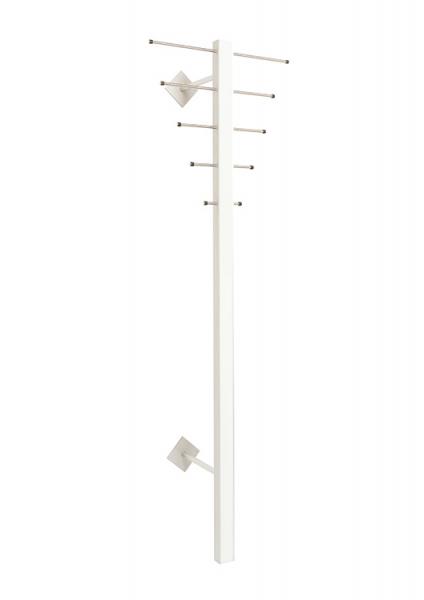 Hoigaard ST-1 stumtjener - Hvid Hoigaards ikoniske stumtjener monteres på væggen og er en stilfuld opbevaringsmulighed til overtøjet. Stumtjeneren monteres med to arme på væggen, men disse er nærmest usynlige, når stumtjeneren først er monteret. Overtøj og tasker kan hænges på 5 knager på hver side. Ikke nok med at stumtjeneren er praktisk, så er den også en spændende, designmæssig tilføjelse - der naturligvis går godt hånd-i-hånd med resten af Hoigaards sortiment. Stumtjeneren er lavet af en kombination af massivt, lakeret træ og eloxeret aluminium, hvor knagerne/stængerne er af rustfrit stål. Specifikationer: