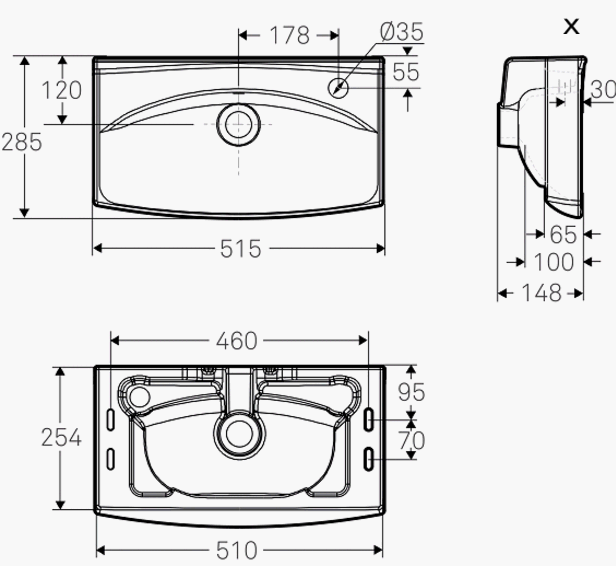 Håndvask med afsætningsplads på bagerste del af vasken. Hanehul til højre. Monteres med bæringer.