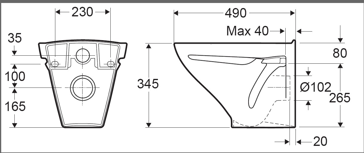 Man kan fint bruge dette væghængte toilet på en eksisterende indbygningscisterne. Man skal blot sikre, at boltafstanden (se måltegning) er den samme som på den skål der er monteret i forvejen. Trykknapperne, eller trykpladen, skal ikke skiftes, den følger indbygningscisternen. Skal du også have en ny indbygningscisterne, så kan du se relaterede varer eller på vores mange toiletpakker.  |
