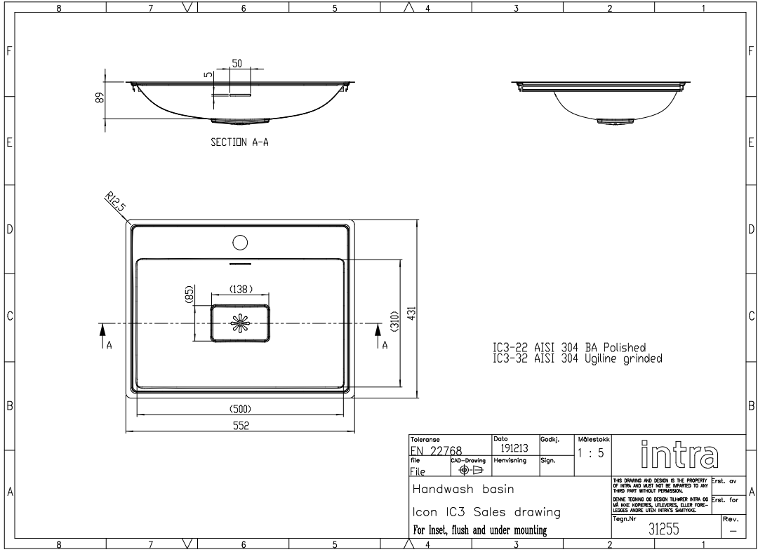 Intra Icon 3 50 håndvask t/underlimning eller planlimning - 1 hanehul Specifikationer: