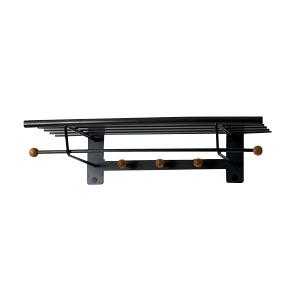 Hattehylden har, udover sin hylde-funktion, nedenunder en knagerække med runde trækugler for enden af hver knage, og en bøjlestang, ligeledes med trækugler for hver ende.