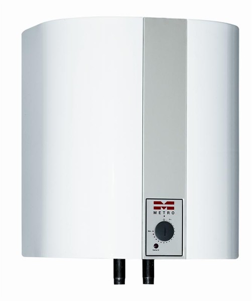 Metro vandvarmer 15 liter til el - rør ned. Trykfast konstruktion - 10 bar til lodret montering på væg eller gulvstativ med rørforbindelserne ned ad.Vandvarmerne monteres som trykbeholder med sikkerhedsventil til flere tappesteder med normalt tryk blandingsbatterier. Vandvarmerne er specielt beregnet til opvarmning af brugsvand til køkken, håndvask og brusebade i énfamilieboligen.Brugsvandet opvarmes af et keramisk elvarmelegeme, der er monteret i et emaljeret flangerør. Herved reduceres kalkopbygning på varmelegemet, og risikoen for gennemtæring af beholderen reduceres.