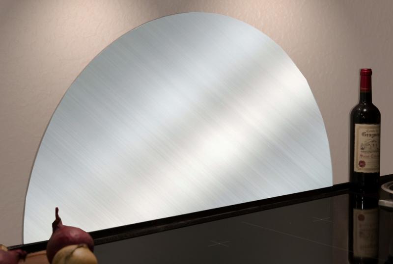 Stænkpladen har form som en halvcirkel og er af rustfrit stål, hvilket er et veloplagt og slidstærkt materiale til brug i køkkenet.