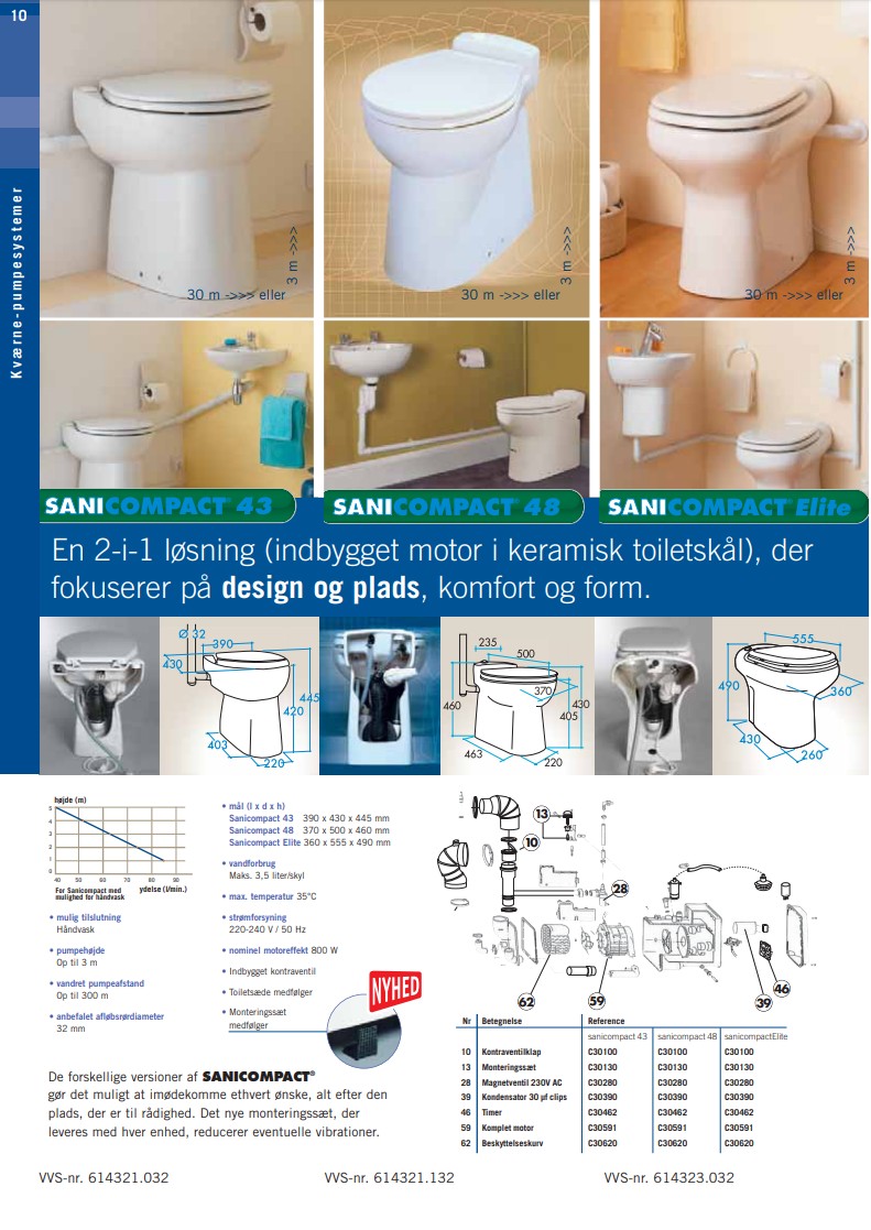 Komplet toilet med toiletsæde (m/ låg). Tryk på skylleknap aktiverer den støjdæmpede motor som bortpumper restproduktet ad et 32 mm afløbsrør. Toilettet er inkl. kontraventil, så restproduktet sendes opad. Mulighed for at tilslutte håndvask. Mål: