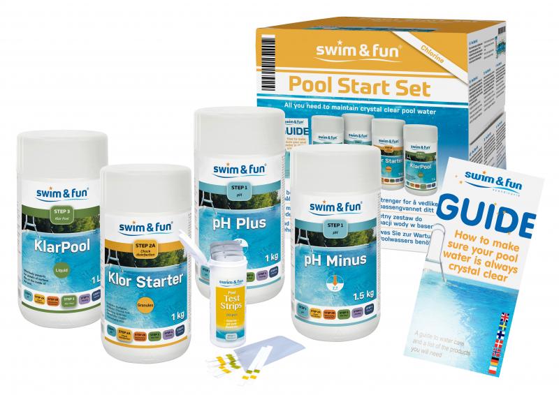 Swim & Fun Pool Start Set Chlorine Startpakke med alle de plejemidler, der er nødvendige for at holde vandet i poolen rent og indbydende.