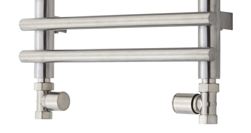 TVS lige ventilsæt type 110 vendbart - Børstet rustfrit stål Ligeløbendeventilsæt type 110 Manuel ventilsæt type 110 er et ligeløbendeventilsæt som bruges når man skal have sin håndklædetørrer monteret på central- / fjernvarmesystemet. Brugen af denne type ventil kræver at der kommer rør op fra gulvet eller ned fra loftet. Man vil typisk bruge denne type ventil hvis man ønsker en løsning der ikke fylder meget og hvor der ikke skal reguleres på varmen jævnligt. Da reguleringen er manuel og ikke termostatstyret vil ventilen være meget følsom og der skal ikke skrues ret meget på ventilhovedet for at stille temperaturen. Ønsker men en ventil med termostat skal man vælge type 210 fra TVS i stedet for. TVS ventilsæt med ligeløbende ventiler - hvid. Manuelt reguleret. Med fremløbsventil og afspærre-/begrænserventil. Specifikationer: