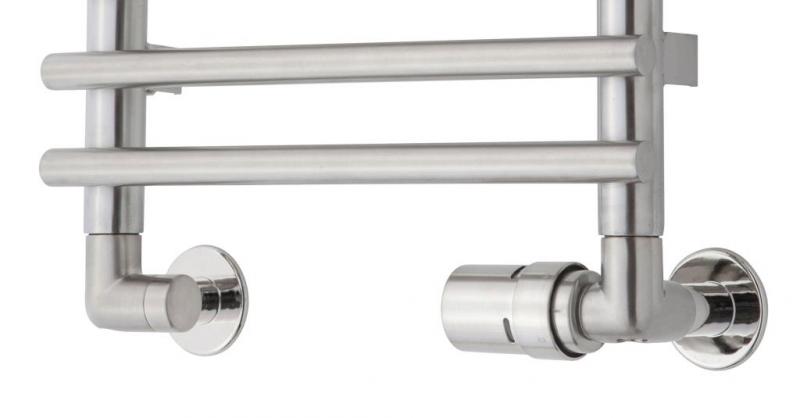 TVS Ventilsæt type 120 m/returtermostat, højre, vinkelløbende - Børstet rustfrit stål Retur ventilsæt type 120 er vinkel ventilsæt med retur termostat som bruges når man skal have sin håndklædetørrer monteret på central- / fjernvarmesystemet. Brugen af denne type ventil kræver at der kommer rør ud fra væggen. Man vil typisk bruge denne type ventil hvis man ønsker en løsning hvor man jævnligt gerne vil stille på temperaturen. Denne type ventil anbefales til fjernvarme. Reguleringen er termostatstyret og dette gør den nem at indstille til den ønskede temperatur. Termostaten skal sidde på den side hvor returvandet kommer. Termostaten vil så sørge for at vandet i håndklædetørreren har en fast og ensartet temperatur. Type 120 og 220 er til de varmesystemer hvor returvandet kommer i højre siden og type 121 og 221 er til venstre side. Til disse ventilsæt medfølger rør afdækninger med rosetter i samme overflade Specifikationer: