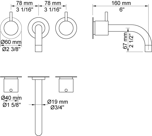 Vola 1511 håndvaskbatteri. To-grebsblander med keramiske ventiler, 1500, fast tud med vandbesparende luftindblander, 010, 3 stk. 60 mm dækroset 001.