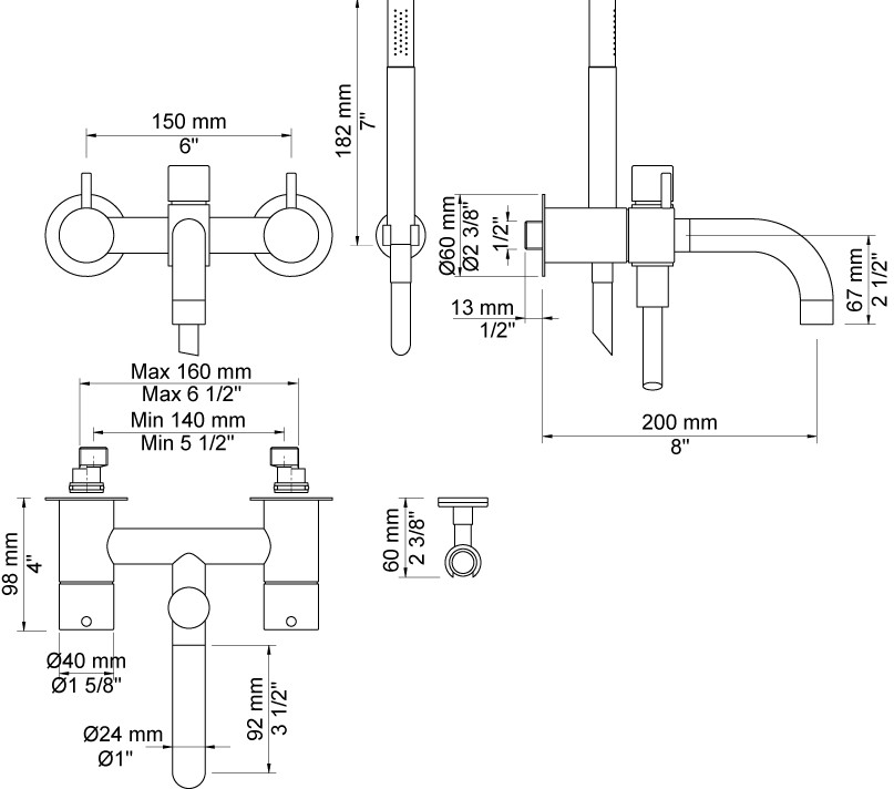 Vola To-grebsblander Fremspring fra væg 205 mm, metalslange Krom 16 ½''RG  |