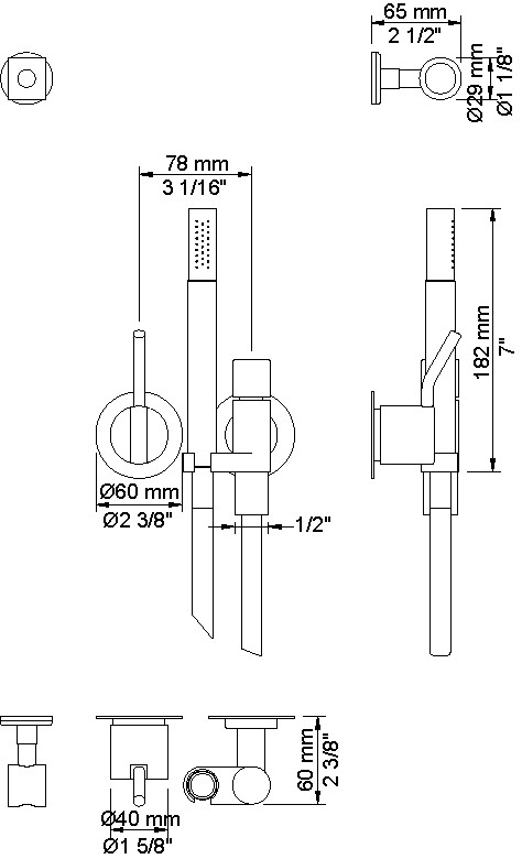 Vola 171MT9-00 håndvaskbatteri med keramisk ventilenhed 100 med fast afgangsmuffe, greb NR18M, håndbruser og holder for håndbruser med kontraventil 070, 60 mm dækrosetter 001, 3001, håndbruserholder T9. Med mellemlangt greb.