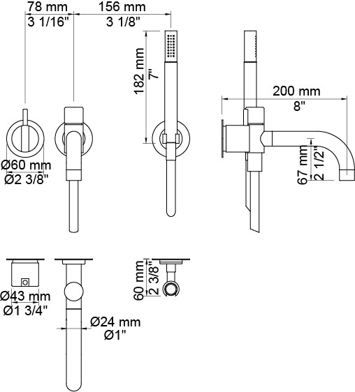 Vola 2141DT8 badekararmarur m/omskifter og håndbruser - Krom