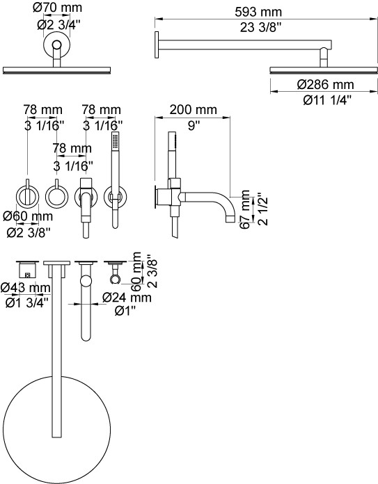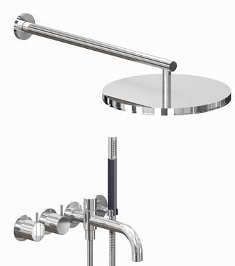 Et-grebsblander med keramisk ventilenhed 2400N, greb NR21, omskiftergreb NR24G, 200 mm kartud med omskifter 040D, vægmonteret hovedbruser 060, Krom  |
