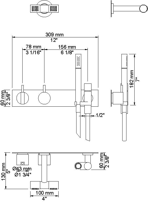 Vola 2473-081D-00 brusearmatur med keramisk ventilenhed 2400F, greb NR21, omskiftergreb NR24G, håndbruser og holder for håndbruser med kontraventil 070, tre-hulsplade 60 x 309 mm 2003, 60 mm dækroset 001.  |
