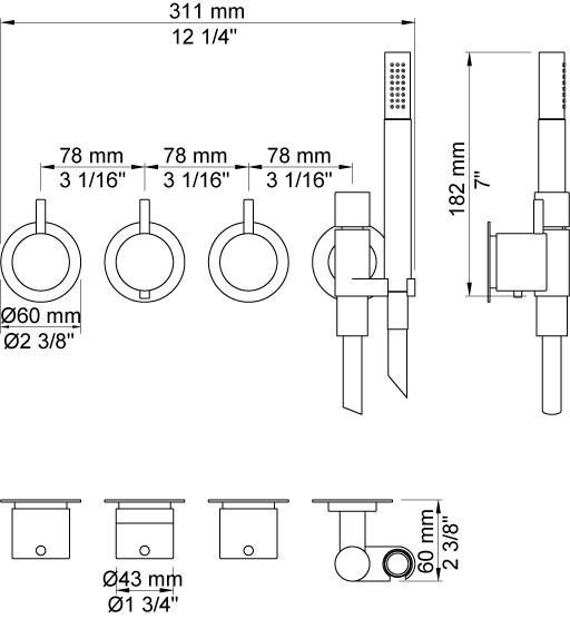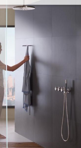 Indbygningstermostat ¾'' med omskifter T2 håndbruser med metalslange og holder til højre Hovedbruser, rund, loftmonteret Separat udløb Rosetter Krom 16 3/4''RG/PEX  |
