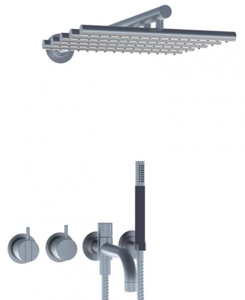 Vola Et-grebsblander for stor vandmængde med keramisk ventilenhed og omskifter samt løs afgangsmuffer. Kartud med omskifter og håndbruser, 200 mm, ø24 mm Vægmonteret hovedbruser Rosetter , lavt monteret Krom 16 ½''RG/PEX  |