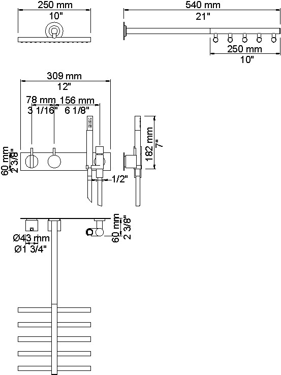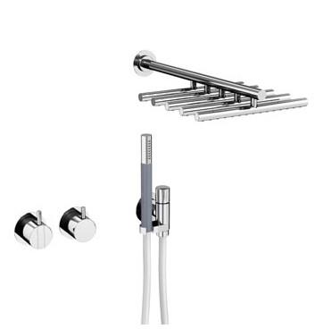 Vola Et-grebsblander for stor vandmængde med keramisk ventilenhed og omskifter samt løs afgangsmuffer. T2 Håndbruser med metalslange og holder Vægmonteret hovedbruser Dækplade Krom 16 ½''RG/PEX Billedet er uden dækplade  |