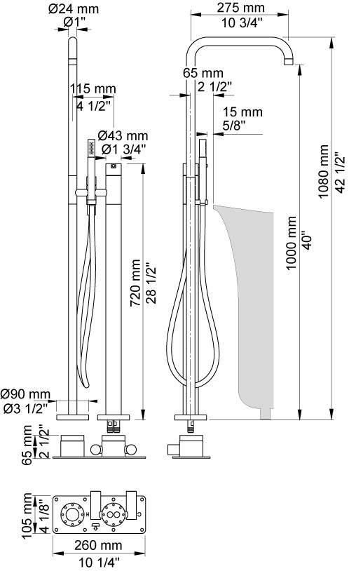 Vola Armatur til fritstående badekar Fast udløb, udlæg 275 mm, Ø24 mm Krom 16 ½''RG/PEX