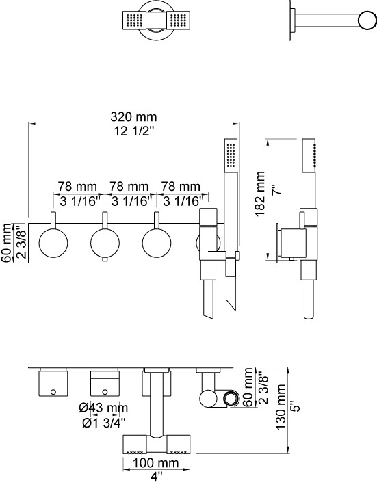 Vola Indbygningstermostat ¾'' med omskifter T2 håndbruser med metalslange og holder til højre Dobbelt hovedbruser, 115 mm Separat udløb Dækplade Krom 16 3/4''RG/PEX  |
