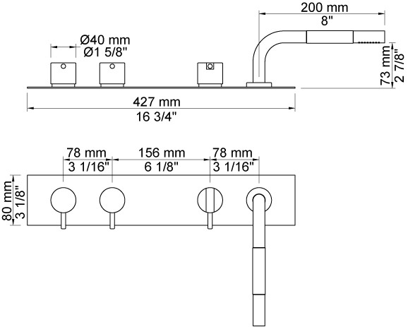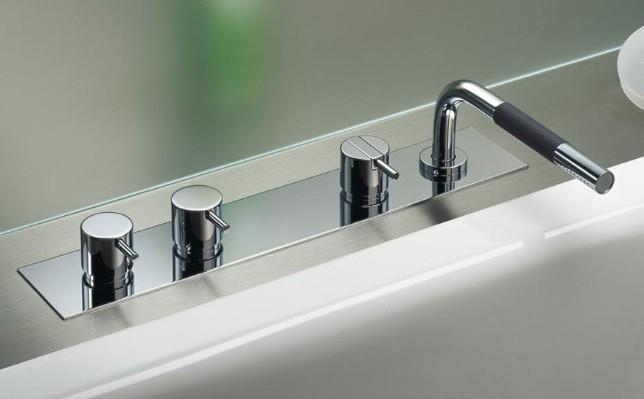 Vola To-grebsblander for karfyldning via overløbsventil og et-grebsblander med håndbruser BK4 Standard 30 mm Komplet med justerbar montageramme og vandopsamlingsbox Krom 16 SPX Bruges med A24 som tilkøbes  |
