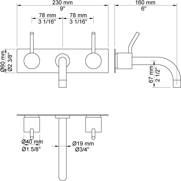 Vola To-grebsblander med afgangsmuffe i midten Fast udløb, 160 mm, ø19 mm Mellemlangt 60 mm Dækplade Krom 16 ½''RG/PEX |
