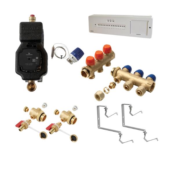 Wavin Tigris / AHC 9000 gulvvarmesystem til 2 kredse, med trådløs styring af rumtemperaturen. OBS: Varen er på lager - både til afhentning og dag-til-dag levering. Med dette komplette system fra Wavin kan du indstille temperaturen i hvert enkelt rum separat, og få varmen præcis som du ønsker den. Systemet leveres med Wavin Tigris parallelshunt, som sikre optimal styring af fremløbstempraturen. Shunten er udstyret med en Grundfos UPM3 pumpe, som er en af de mest energibesparende pumper på markedet og derved sikres et lavt strømforbrug. Pakken består af: