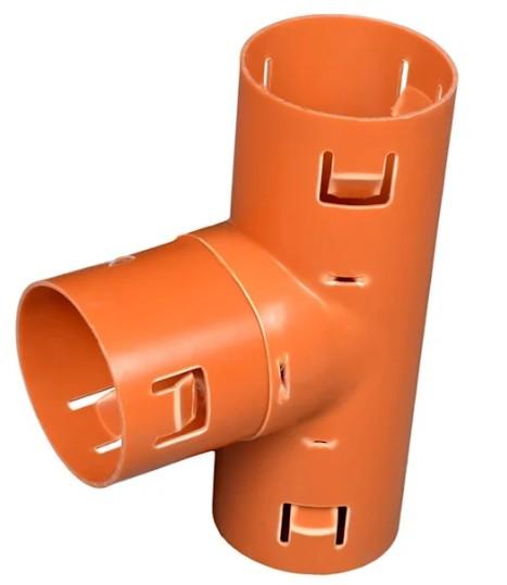 Wavin 92/80 mm 90 grader PVC-drængrenrør til udvendig samling af 3 rørspidser, hvoraf den ene er en afgrening.