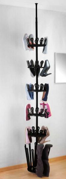 Stativet bringer orden i kaosset, og det sparer gulvplads. Stativet består af en sort metalstang, hvorpå 6 ringe af plastik er placeret. På de 6 ringe kan der opbevares 30 par sko og 6 par støvler. Ringene kan drejes, så der nemt er adgang til alle sko.